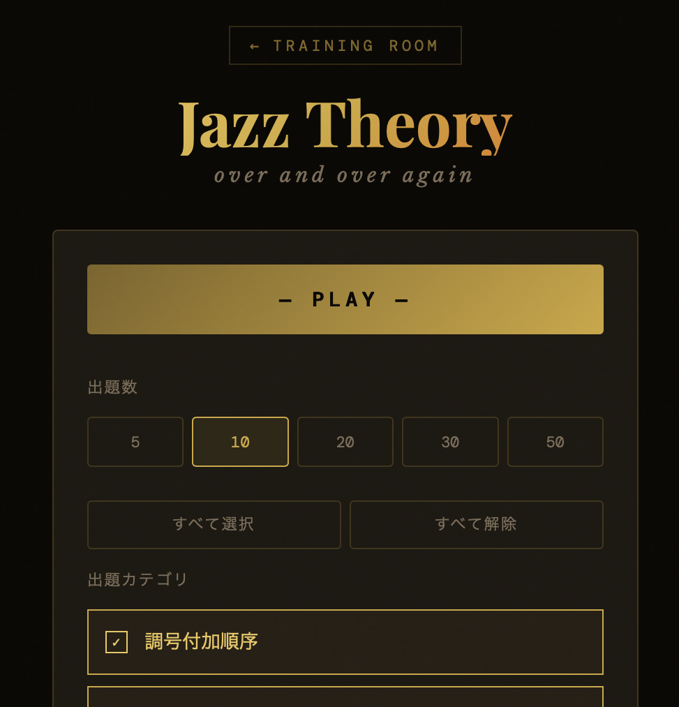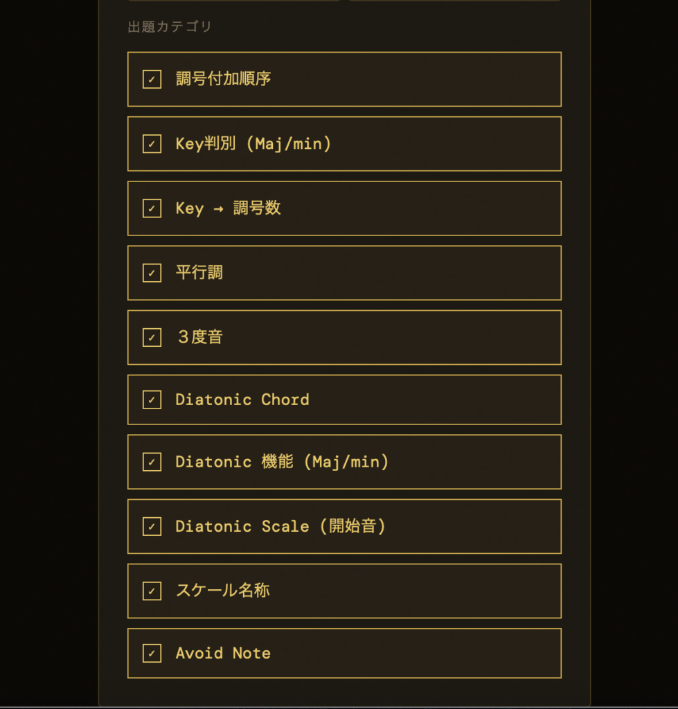 操作はとっても簡単。【出題数】と【出題項目】を選んでPLAYを押すだけでランダムに音楽理論のクイズが出題されます。出題項目はデフォルトですべてが選択されていますが、一括解除ができますので苦手な項目だけ集中特訓も可能です!
