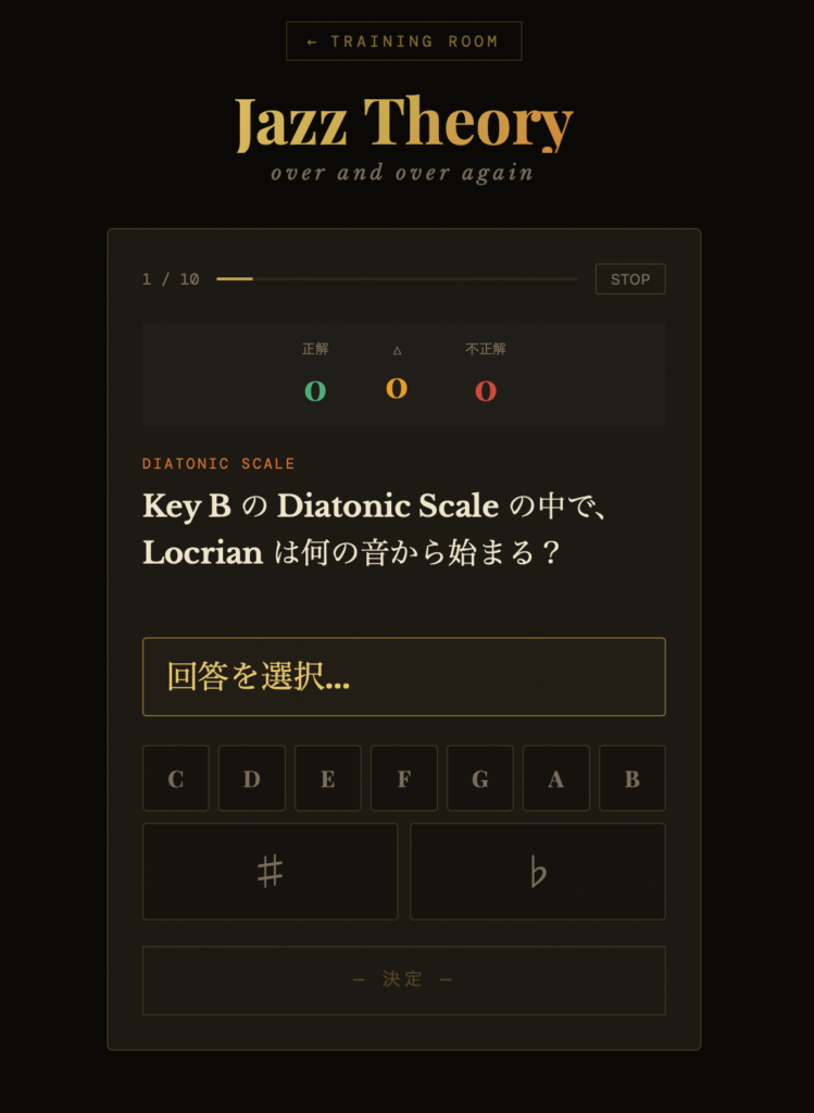 下記画像は⑧Diatonic Scaleが出題されていますね。回答をボタンで選んで決定を押すだけ!