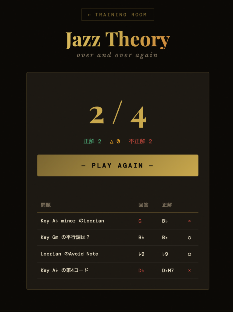 音楽理論は分かっているけれど、使えるようにする(瞬時に答えられるようにする)ためには反復練習が必要です。ジャズギター大学オリジナル・アプリ「Jazz Theory」では、10項目の内容をクイズ形式でランダムに出題。回答後の結果一覧ページで、正誤の確認も可能です。特にminor Keyの出題内容が苦手な方が多いです。楽しみながら隙間時間学習していきましょう!