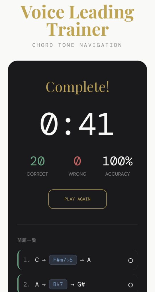 下に表示されたスタート音と4音は5フレット分の指板(フレット)だと考えると上手くいきます。私も実際に指板を見ているイメージで回答する回答時間が早いです(Max 41秒/20問です。どうしても◯❌の表示に1秒かかるので40秒は切れません。答えたあとの次の問題は、その音から最も近いコードトーンを探すことになり、また答えた音から近い音を探す訓練です。)