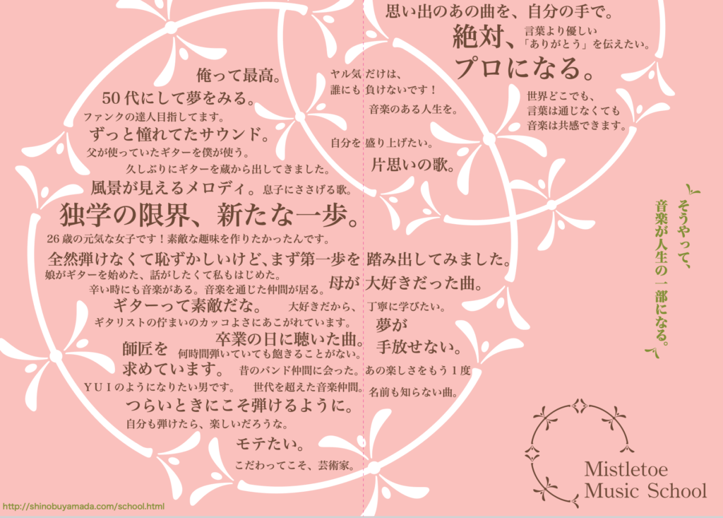 下記は「Mistletoe Music School」 の入口で入手可能なチラシです!生徒さんがスクールに入会されるときの言葉を集めたものです。そうやって、音楽が人生の一部になるんです!