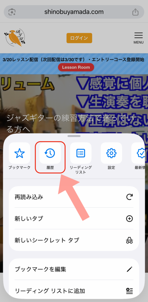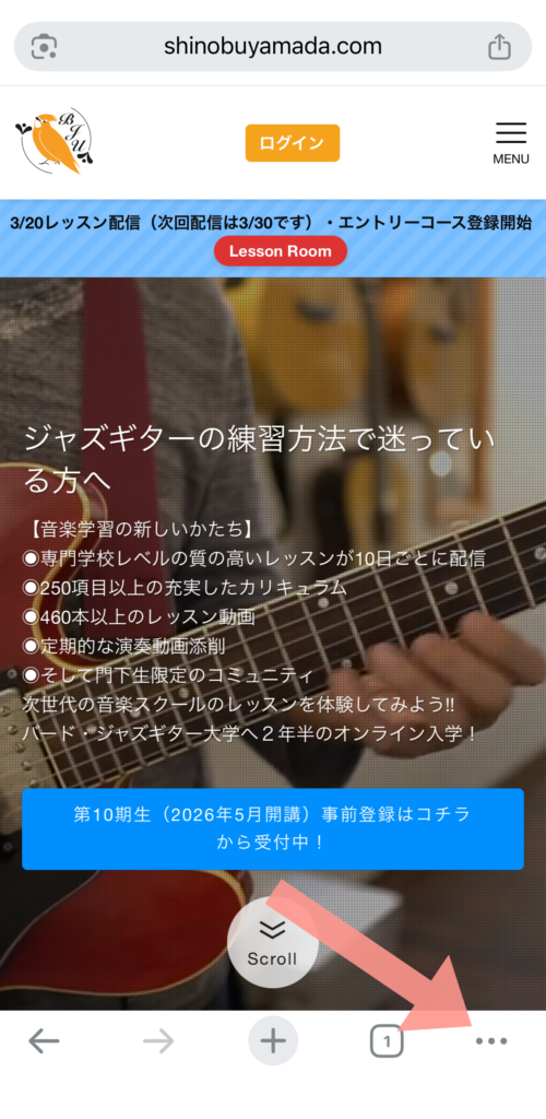 ジャズギター大学のサイトを開いて「3点リーダー」をタップ