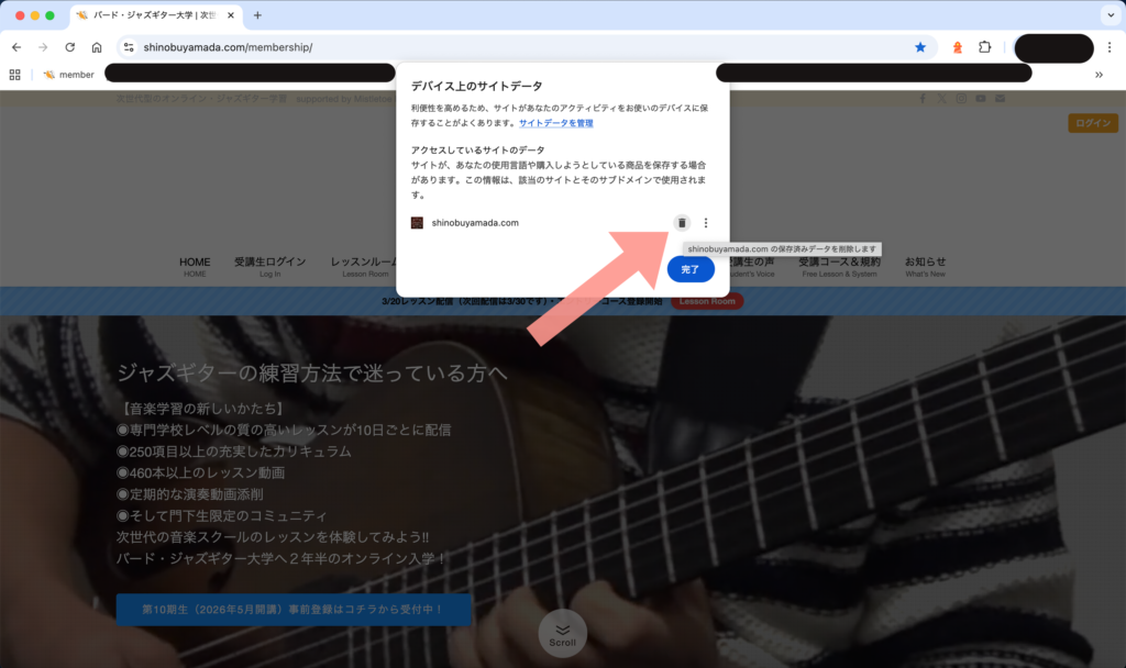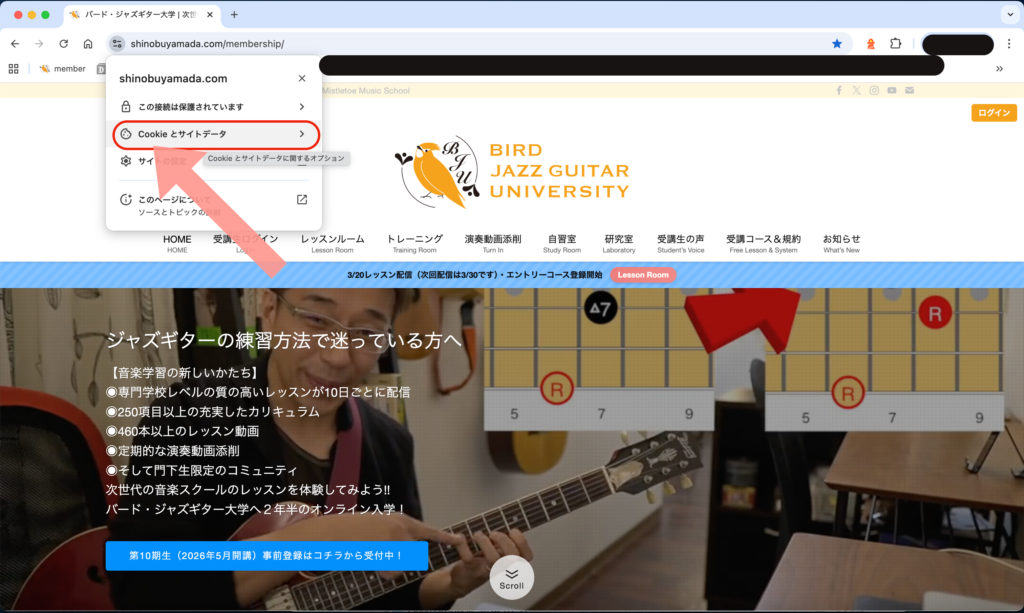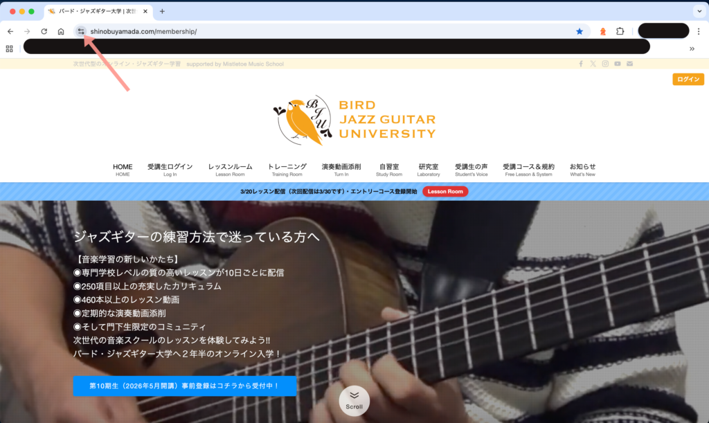 ジャズギター大学のサイトを開いて矢印のアイコンをクリック!